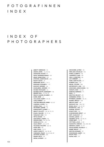 105F O T O G R A F I N N E N INDEXI N D E X O F PHOTOGRAPHERSABBOTT, BERENICE 15ADAMS, ANSEL 34, 35, 36AFANADOR, RUVEN 107AGHA, MEHEMED FEHMY 25ARAKI, NOBUYOSHI 113ATWOOD, JANE EVELYN 102BAILEY, DAVID 81BERNHARD, RUTH 7, 8, 9BINGHAM, HOWARD L. 77BISCHOF, WERNER 44BOKELBERG, WERNER 91BOUBAT, %u00c9DOUARD 24BOURKE-WHITE, MARGARET 38BRANDT, BILL 27, 28, 29BRAVO, MANUEL %u00c1LVAREZ 18BURRI, REN%u00c9 47CALLAHAN, HARRY 31, 33CAPA, ROBERT 45CARTIER-BRESSON, HENRI 22, 63CLERGUE, LUCIEN 94CUPIDO, PAUL 117, 118DE DIENES, ANDR%u00c9 74EISENSTAEDT, ALFRED 4ERWITT, ELLIOTT 46, 66, 72, 73EVANS, WALKER 10, 11, 14FARASSAT, SISSI 119FRITZ, ROGER 79GIACOMELLI, MARIO 54GOLDIN, NAN 114, 115, 116GUNDLACH, F.C. 65HAAS, ERNST 40, 41, 99HALSMAN, PHILIPPE 68, 96HANG, REN 98HINE, LEWIS 12, 13HORST, HORST P. 26, 30, 69HUBMANN, FRANZ 86, 87, 88, 89JACKSON, ALISON 120KEMPE, FRITZ 53KEPES, GY%u00d6RGY 52KIRCHHERR, ASTRID 78KIRKLAND, DOUGLAS 110KORDA, ALBERTO 58LAGERFELD, KARL 95LINK, O. WINSTON 56LIST, HERBERT 62MARK, MARY ELLEN 71McBRIDE, WILL 83MEISEL, STEVEN 108MEYEROWITZ, JOEL 103MINKKINEN, ARNO RAFAEL 82MORATH, INGE 43, 60MORGAN, BARBARA 17NASA 57NEWTON, HELMUT 93N%u00dcRNBERG, PETER 70PETERSEN, ANDERS 90, 92RAINER, ARNULF 109RIBOUD, MARC 48RIGOULET, GIL 100, 101RONIS, WILLY 23, 67, 97ROSENTHAL, JOE 59SANDER, AUGUST 6SCHATT, ROY 80SCHEIDEGGER, ERNST 42SIEFF, JEANLOUP 55SISKIND, AARON 32STEINERT, OTTO 49, 50, 51STERN, BERT 75, 76STETTNER, LOUIS 5, 85SUGIMOTO, HIROSHI 104, 105, 106SZ%u00c9KESSY, KARIN 61, 111VON GLOEDEN, WILHELM 2WEBER, BRUCE 112WESTON, EDWARD 37WINOGRAND, GARRY 84WOLFF, PAUL 1, 3YAVNO, MAX 39