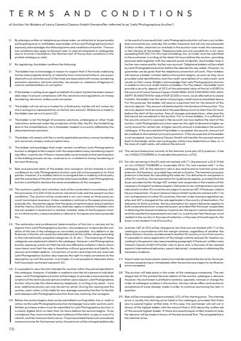 1101) By placing a written or telephone purchase order, an online bid or by personally participating as an in-hall bidder, each bidder at the Leitz Photographica Auction expressly acknowledges the following terms and conditions of auction. The auction conditions also apply to the post-sale. In case of complaints or ambiguities due to incorrect translation, the German text of the auction conditions in the printed catalogue is valid.2) By registering, the bidder confirms the following:3) The bidder has no knowledge or reason to suspect that (i) the funds underlying his/her bids originate directly or indirectly from criminal activities or are associated with such activities and (ii) the funds are associated with money laundering, economic sanctions, terrorist activities, tax evasion or violations of legal provisions to combat bribery or corruption.4) If the bidder is acting as an agent on behalf of a client, he/she has taken reasonable steps to ensure compliance with the sanctions and regulations on money laundering, terrorism, bribery and corruption.5) The bidder will not act as a trustee for a third party; he/she will act (unless he/she is acting as a representative) on his/her own account. Reference is made to the bidder ban set out in point 22).6) The bidder is not the target of economic sanctions, embargoes or other trade restrictions enforced under the jurisdiction of the USA, the EU, the United Kingdom or the United Nations, nor is the bidder resident in a country affected by the aforementioned sanctions.7) The bidder will comply with the currently applicable sanctions, money laundering, anti-terrorism, bribery and corruption laws.8) The bidder acknowledges that under certain conditions Leitz Photographica Auction is obliged to file a report with the responsible money laundering reporting office, in particular if there is reasonable cause to believe that participation in the bidding process serves, could serve or is related to money laundering or terrorist financing.9) Bids and personal data of the bidder and consignor will be treated in strict confidence by Leitz Photographica Auction and will not be passed on to third parties. However, if a credible claim to a consigned item is made by a third party and the ownership of the item cannot be otherwise clarified, Leitz Photographica Auction is entitled to disclose the name and address of the consignor.10) The auction is public and voluntary and will be conducted in accordance with the provisions of %u00a7 158 of the Austrian Industrial Code and the present auction conditions. The auction will be conducted in our own name on third-party account (commission business). Unless mandatory national or European provisions preclude this, the parties agree that the place of performance and jurisdiction shall be Vienna, Austria. Austrian law shall also apply in relation to bidders who are not resident in Austria but in another member state of the European Union or in a third country, unless mandatory national or European provisions preclude this.11) The estimation and professional determination of the lots is carried out by experts from Leitz Photographica Auction, who endeavour to describe the condition of the lots in the catalogue as accurately as possible. Any defects or deficiencies in the lots will usually be indicated and all lots will be valued according to the internationally accepted categories (A, B, etc.). The meanings of these categories are explained in detail in the catalogue. However, Leitz Photographica Auction expressly points out that the lots are offered as collector%u2019s items (showcase items) and that the sale is therefore without guarantee and liability for obvious and hidden defects. Corrections of errors and misprints are reserved. Leitz Photographica Auction also reserves the right to make corrections to the description up until the auction. In principle, it is not possible to take back items that have been auctioned (see point 12).12) It is possible to view the lots intended for auction within the period specified in the catalogue. However, if a bidder is unable to view the lot in person in individual cases, Leitz Photographica Auction will be happy to provide a more precise description of the technical and optical condition upon request. Leitz Photographica Auction will provide this information by telephone, in writing or by email %u2013 however, additional photos can only be sent by email. During the viewing and the auction, each visitor is fully liable for any damage caused by him/her to the lots and releases Leitz Photographica Auction from any claims by the consignor.13) Before the auction begins, bids can be submitted in writing (letter, fax, e-mail) or online via the Leitz Photographica Auction homepage (www.leitz-auction.com). Written purchase orders must be submitted to Leitz Photographica Auction in a clearly legible form no later than 24 hours before the auction begins. To be considered, they must include the exact address of the client, a copy or scan of a valid ID, and the maximum bid in euros. The prices stated therein are considered maximum prices for the hammer price; the premium will be charged additionally TERMS AND CONDITIONSof Auction for Bidders of Leica Camera Classics GmbH (hereinafter referred to as %u2018Leitz Photographica Auction%u2019)in the event of a successful bid. Leitz Photographica Auction will carry out written bids conscientiously, whereby the written maximum bid will only be exhausted if other written, electronic or oral bids in the auction room make this necessary in the interest of the bidder. Telephone bids are only possible for a lot value exceeding EUR 500. For this type of bidding, too, an order must be submitted to the auctioneer in writing at the latest 24 hours before the auction, providing personal data together with the relevant proof of identity. Each bidder bids in his/her own name and for his/her own account. Telephone bidders will be called by Leitz Photographica Auct