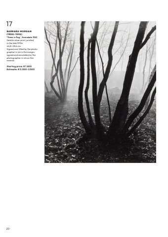 2017B A R B A R A M O R G A N ( 1 9 0 0 %u2013 1 9 9 2 ) %u2018Trees in Fog%u2019, Scarsdale 1941Gelatin silver print, printedin the late 1970s44,8 %u00d7 35,4 cmSigned and titled by the photographer in ink in the margin, signed and annotated by thephotographer in ink on the reverseStarting price: %u20ac 1.800Estimate: %u20ac 3.000%u20133.500