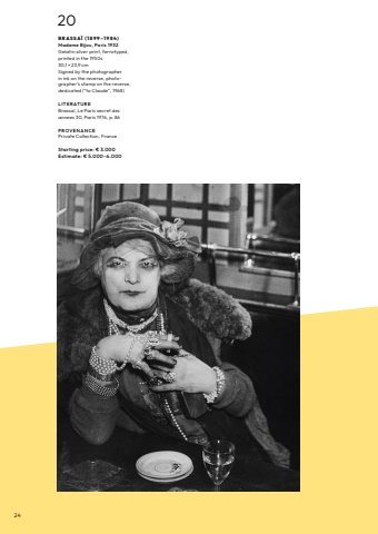2420B R A S S A %u00cf ( 1 8 9 9 %u2013 1 9 8 4 ) Madame Bijou, Paris 1932Gelatin silver print, ferrotyped, printed in the 1950s30,1 %u00d7 23,9 cmSigned by the photographer in ink on the reverse, photographer%u2019s stamp on the reverse, dedicated (%u201cto Claude%u201d, 1968)L I T E RATU RE Brassa%u00ef, Le Paris secret des annees 30, Paris 1976, p. 86PROV E N AN C E Private Collection, FranceStarting price: %u20ac 3.000Estimate: %u20ac 5.000%u20136.000