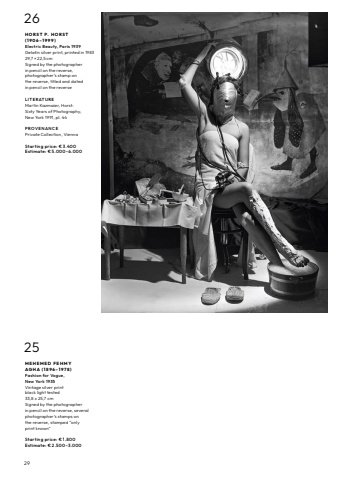 2925M E H E M E D F E H M Y AG H A ( 1 8 9 6 %u2013 1 9 7 8 ) Fashion for Vogue, New York 1935Vintage silver printblack light tested33,8 x 25,7 cmSigned by the photographer in pencil on the reverse, several photographer%u2019s stamps on the reverse, stamped %u201conly print known%u201dStarting price: %u20ac 1.800Estimate: %u20ac 2.500%u20133.00026H O R S T P. H O R S T ( 1 9 0 6 %u2013 1 9 9 9 ) Electric Beauty, Paris 1939Gelatin silver print, printed in 198329,7 %u00d7 22,5 cmSigned by the photographer in pencil on the reverse, photographer%u2019s stamp on the reverse, titled and dated in pencil on the reverseL I T E RATU RE Martin Kazmaier, Horst: Sixty Years of Photography, New York 1991, pl. 44PROV E N AN C E Private Collection, ViennaStarting price: %u20ac 3.400Estimate: %u20ac 5.000%u20136.000