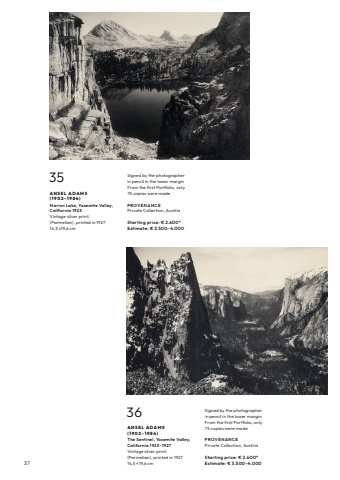 3736ANSEL ADAMS( 1 9 0 2 %u2013 1 9 8 4 ) The Sentinel, Yosemite Valley, California 1923%u20131927Vintage silver print, (Parmelian), printed in 192714,3 %u00d7 19,6 cmSigned by the photographer in pencil in the lower marginFrom the first Portfolio, only 75 copies were madePROV E N AN C E Private Collection, AustriaStarting price: %u20ac 2.600*Estimate: %u20ac 3.500%u20134.00035A N S E L A D A M S ( 1 9 0 2 %u2013 1 9 8 4 ) Marion Lake, Yosemite Valley, California 1923Vintage silver print, (Parmelian), printed in 192714,3 x19,6 cmSigned by the photographer in pencil in the lower marginFrom the first Portfolio, only 75 copies were madePROV E N AN C E Private Collection, AustriaStarting price: %u20ac 2.600*Estimate: %u20ac 3.500%u20134.000