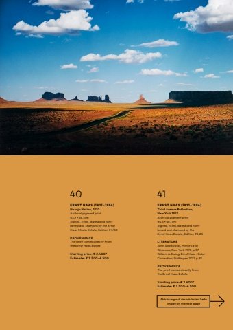 40E R N S T H A A S ( 1 9 2 1 %u2013 1 9 8 6 ) Navajo Nation, 1970Archival pigment print43,9 %u00d7 66,1 cmSigned, titled, dated and numbered and stamped by the Ernst Haas Studio Estate, Edition #4/50PROV E N AN C E The print comes directly from the Ernst Haas EstateStarting price: %u20ac 2.400*Estimate: %u20ac 3.500%u20134.50041E R N S T H A A S ( 1 9 2 1 %u2013 1 9 8 6 ) Third Avenue Reflection, New York 1952Archival pigment print44,3 %u00d7 66,1 cmSigned, titled, dated and numbered and stamped by the Ernst Haas Estate, Edition #3/25LITERATUREJohn Szarkowski, Mirrors and Windows, New York 1978, p.57William A. Ewing, Ernst Haas : Color Correction, G%u00f6ttingen 2011, p.92PROV E N AN C E The print comes directly fromthe Ernst Haas EstateStarting price: %u20ac 2.600*Estimate: %u20ac 3.500%u20134.500Abbildung auf der n%u00e4chsten SeiteImage on the next page