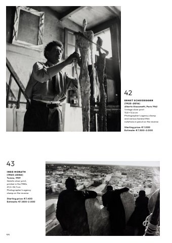4442E R N S T S C H E I D E G G E R ( 1 9 2 3 %u2013 2 0 1 6 ) Alberto Giacometti, Paris 1962Vintage silver print13,8 %u00d7 12,6 cmPhotographer%u2019s agency stamp and various handwritten notations in pencil on the reverseStarting price: %u20ac 1.000Estimate: %u20ac 1.500%u20132.00043I N G E M O R AT H ( 1 9 2 3 %u2013 2 0 0 2 ) Tunisia, 1959Gelatin silver print, printed in the 1980s21,5 %u00d7 32,7 cmPhotographer%u2019s agency stamp on the reverseStarting price: %u20ac 1.400Estimate: %u20ac 1.800%u20132.000