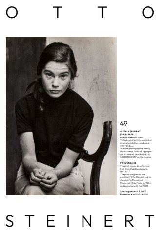 49O T T O S T E I N E R T ( 1 9 1 5 %u2013 1 9 7 8 ) Bildnis Claude 2, 1952Vintage silver print, mounted on original exhibition cardboard39,9 %u00d7 27,8 cmWith the photographer%u2019s early studio stamp %u201cFoto + Copyright /DR. STEINERT KEPLERSTR. 3 / SAARBR%u00dcCKEN%u201d on the reversePROV E N AN C E The print comes directly from Foto Cine Club Bandeirante (FCCB).The print was part of the exhibtion %u201cOtto Steinert and his students%u201d in Museum of Modern Art S%u00e3o Paulo in 1955 in collaboration with the FCCB.Starting price: %u20ac 3.200*Estimate: %u20ac 4.000%u20135.000OTTOSTEINERT