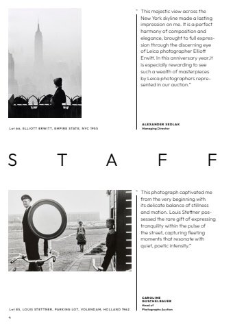 4STAFFALEXANDER SEDLAKManaging Director%u201c This majestic view across the New York skyline made a lasting impression on me. It is a perfect harmony of composition and elegance, brought to full expression through the discerning eye of Leica photographer Elliott Erwitt. In this anniversary year,it is especially rewarding to see such a wealth of masterpieces by Leica photographers represented in our auction.%u201dCAROLINEGUSCHELBAUERHead of Photographs Auction%u201c This photograph captivated me from the very beginning with its delicate balance of stillness and motion. Louis Stettner possessed the rare gift of expressing tranquility within the pulse of the street, capturing fleetingmoments that resonate withquiet, poetic intensity.%u201dLot 85, LOUIS STETTNER, PARKING LOT, VOLENDAM, HOLLAND 1962Lot 66, ELLIOTT ERWITT, EMPIRE STATE, NYC 1955
