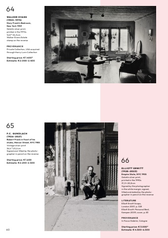 6064WA L K E R E VA N S ( 1 9 0 3 %u2013 1 9 7 5 ) Mary Frank%u2019s Bedroom, New York 1959Gelatin silver print, printed in the 1970s16,8 %u00d7 24,3 cmWalker Evans Estate stamp on the reversePROVENANCEPrivate Collection, USA acquired through Harry Lunn CollectionStarting price: %u20ac 1.400*Estimate: %u20ac 2.000%u20132.40066E L L I O T T E R W I T T ( 1 9 2 8 %u2013 2 0 2 3 ) Empire State, NYC 1955Gelatin silver print, printed in the 1990s31,3 %u00d7 20,8 cmSigned by the photographer in the white margin; signed, titled and dated by the photographer in pencil on the reverseLITERATUREElliott Erwitt Snaps, London 2001, p. 328Elliott Erwitt: Personal Best, Kempen 2009, cover, p. 83PROV E N AN C E In Focus Galerie, CologneStarting price: %u20ac 3.000*Estimate: %u20ac 4.500%u20136.50065F. C . G U N D L AC H ( 1 9 2 6 %u2013 2 0 2 1 ) Robert Frank in front of his studio, Mercer Street, NYC 1985Vintage silver print34,4 %u00d7 23,2 cmSigned and titled by the photographer in pencil on the reverseStarting price: %u20ac 1.600Estimate: %u20ac 2.200%u20132.500