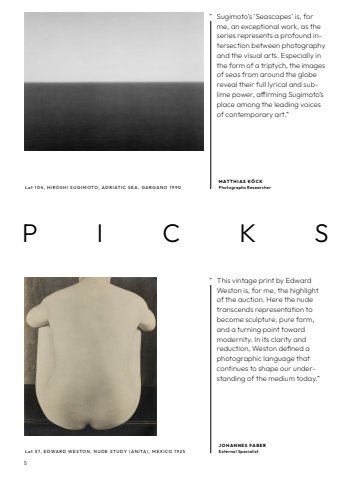 5%u201c This vintage print by Edward Weston is, for me, the highlight of the auction. Here the nude transcends representation to become sculpture, pure form, and a turning point toward modernity. In its clarity and reduction, Weston defined a photographic language that continues to shape our understanding of the medium today.%u201dMATTHIAS K%u00d6 CKPhotographs Researcher%u201c Sugimoto%u2019s %u2018Seascapes%u2019 is, for me, an exceptional work, as the series represents a profound intersection between photographyand the visual arts. Especially inthe form of a triptych, the imagesof seas from around the globe reveal their full lyrical and sublime power, affirming Sugimoto%u2019s place among the leading voices of contemporary art.%u201dJOHANNES FABERExternal SpecialistPICKSLot 104, HIROSHI S UGIMOTO, ADRIATIC SEA, GARGANO 1990Lot 37, EDWARD WESTON, NUDE STUDY (ANITA), MEXICO 1925