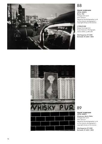 7588F R A N Z H U B M A N N (1914%u20132007)Berlin, 1961Vintage silver print22,5 %u00d7 33,5 cmSigned by the photographer in ink on the reverse, photographer%u2019s copyright stamp on the reverseLITERATUREMargit Zuckriegl et al., Franz Hubmann: Photograph, Vienna 2004. p. 238%u2013239Starting price: %u20ac 1.000Estimate: %u20ac 1.600%u20131.80089F R A N Z H U B M A N N ( 1 9 1 4 %u2013 2 0 0 7 ) Whisky pur, Berlin 1960sVintage silver print33,6 %u00d7 22,6 cmSigned by the photographer in ink on the reverse, photographer%u2019s copyright stamp on the reverseStarting price: %u20ac 1.000Estimate: %u20ac 1.600%u20131.800
