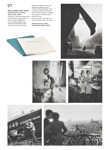 8197W I L LY R O N I S ( 1 9 1 0 %u2013 2 0 0 9 ) Portfolio with 12 Collotype Plates, 1940s%u20131950sWilly Ronis: Twelve collotypes with a text by Ronis, Galerie Camera Obscura, Edition #186/290,two-point folio of Bakri ivory paper containing Mac%u00e9%u2019s text, facsimile hand-written text by Ronis and colophon, hand-numbered and signed by Ronis,3 folios of the same paper, each containing additional facsimile hand-written text plus 4 collotype reproductions on 100 % cotton paper (12 total),housed in green rag paper over board slipcase, each c. 26 %u00d7 21 cmStarting price: %u20ac 1.400Estimate: %u20ac 2.000%u20132.500