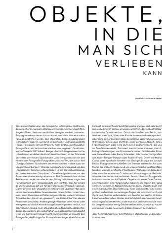 7Konzept, es braucht nicht zuletzt physische Energie. Und es braucht den unbedingten Willen, etwas zu schaffen, das unbestreitbar %u00e4sthetische Qualit%u00e4ten hat. Durch die Stra%u00dfen von Berlin, Volendam, New York, Wien oder Rio de Janeiro sind viele spaziert. Aber ohne den ordnenden Blick, die selektive Wahrnehmung eines Willy Ronis, eines Louis Stettner, einer Berenice Abbott, eines Franz Hubmann oder Ren%u00e9 Burri keine bildhafte Ikone, die uns im Zweifel %u00fcberrascht, fasziniert, ber%u00fchrt oder staunen macht. Fotografien bringen uns Prominente n%u00e4her: Gr%u00f6%u00dfen des Films wie James Dean oder Romy Schneider, Jahrhundertfotografen wie Albert Renger-Patzsch oder Robert Frank, Diven wie Maria Callas oder epochale K%u00fcnstler von Georges Braque bis Joseph Beuys. Fotografien erschlie%u00dfen uns fremde Welten bis hin zum Mond. Sie stellen Fragen rund um unsere irdische Existenz (Nan Goldin), wecken erotische Phantasien (Wilhelm von Gloeden) oder stimulieren wie bei O. Winston Link nostalgische Gef%u00fchle. Was die zitierten Motive verbindet: Sie sind %u00fcber das Dargestellte hinaus immer auch Objekte. Objekte mit einer Oberfl%u00e4che, einer R%u00fcckseite, einer Grammatur. Objekte, die man in die Hand nehmen, wenden, in Nahsicht studieren kann. Objekte auch mit einer individuellen %u00dcberlieferung, einer Geschichte. Inzwischen gr%u00fc%u00dfen sie her%u00fcber aus analogen Tagen, als sich noch Licht und Optik und Chemie verb%u00fcndeten, um Fenster zur Welt in all ihren Facetten aufzusto%u00dfen. Und es sind tats%u00e4chlich Werke einer Kunst mit fotografischen Mitteln, in die man sich verlieben und die man f%u00fcr vergleichsweise wenig Geld erwerben kann, um sich zu Hause und immer wieder neu einem gro%u00dfen Staunen auszusetzen.%u201eDer Autor lebt als freier Schriftsteller, Fotohistoriker und Kurator in M%u00fcnchen.%u201cWas sie nicht alles kann, die Fotografie: Informieren, illustrieren, dokumentieren. Sie kann W%u00e4nde schm%u00fccken, Erinnerung stiften, Augen %u00f6ffnen. Sie kann verbl%u00fcffen, Neugier wecken, irritieren. Propaganda kann sie auch %u2013 und Kunst, nat%u00fcrlich. Wobei von Anfang an gestritten wurde, ob Fotografie, dieses Findelkind der technischen Moderne, nun Kunst sei oder nicht. Eine falsch gestellte Frage. Fotografie ist nicht Malerei, nicht Grafik, nicht Skulptur. Fotografie ist ein technisches Medium von %u201eeigenen%u201c Qualit%u00e4ten, worauf bereits 1927 Albert Renger-Patzsch hingewiesen hatte: %u201e%u00dcberlassen wir daher die Kunst den K%u00fcnstlern%u201c, so der f%u00fchrende Vertreter der Neuen Sachlichkeit, %u201eund versuchen wir mit den Mitteln der Fotografie Fotografien zu schaffen, die durch ihre %u201efotografischen%u201c Qualit%u00e4ten bestehen k%u00f6nnen, %u2013 ohne dass wir von der Kunst borgen.%u201c Was die Fotografie grundlegend von den %u201eh%u00e4ndischen%u201c K%u00fcnsten unterscheidet, ist ihr Wirklichkeitsbezug, ihr %u201eindexikalischer Charakter%u201c. Ohne Marilyn Monroe vor der Fotokamera keine Marilyn Monroe im Bild. Ohne ein tats%u00e4chliches Rendezvous, ein erstes oder letztes %u201eSitting%u201c mit dieser tragischen Pers%u00f6nlichkeit der Filmgeschichte kein Portr%u00e4t. Was f%u00fcr Andr%u00e9 de Dienes ebenso gilt wie f%u00fcr Bert Stern oder Philippe Halsman. Damit gewinnt die Fotografie eine literarische Qualit%u00e4t: Man kann sich in bestimmte Bilder hineindenken, hineinf%u00fchlen, hineintr%u00e4umen, kann Phantasie entfalten angesichts der unbestreitbaren Tatsache des %u201eEs-ist-so-gewesen%u201c, wie Roland Barthes dieses Ph%u00e4nomen beschrieb. Anders gesagt: Was man sieht, hat so oder wenigstens so %u00e4hnlich einmal stattgefunden %u2013gestern, neulich, vor Jahrzehnten. Und ja: Die Fotografie ist ein technisches Bildmittel, dabei alles andere als %u201eselbstt%u00e4tig%u201c, wie gelegentlich behauptet wird. Die Kamera im Regal macht noch kein Bild. Es braucht den Fotografen, die Fotografin. Es braucht ein Auge, eine Vision, ein Von Hans-Michael KoetzleO B J E K T E , I N D I E M A N S I C H V E R L I E B E N KANN