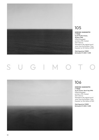 91106H I R O S H I S U G I M O T O (*1948)Arctic Ocean, Nord Cap 1990Offset lithograph,printed in 1991, framed23,9 %u00d7 30,9 cmStamped on the original mount verso, from the Portfolio %u201cTime Exposed%u201d pl. 334, Edition of 500Starting price: %u20ac 800Estimate: %u20ac 1.200%u20131.400105H I R O S H I S U G I M O T O ( * 1 9 4 8 ) South Pacific Ocean, Wiahau 1990Offset lithograph,printed in 1991, framed23,9 %u00d7 30,9 cmStamped on the original mount verso, from the Portfolio %u201cTime Exposed%u201d pl. 327, Edition of 500Starting price: %u20ac 800Estimate: %u20ac 1.200%u20131.400SUGIMOTO