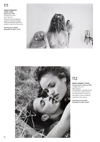 96112B R U C E W E B E R ( * 1 9 4 6 ) Kissing Couple, California 1992Vintage silver print33,9 %u00d7 26,4 cmPhotographer%u2019s copyright stamp on the reverse, titled %u201cFashion For Vogue 4/1992%u201d in pencil on the reverse, various numerical notations on the reverseStarting price: %u20ac 1.600Estimate: %u20ac 2.200%u20132.400111K A R I N S Z %u00c9 K E S S Y ( 1 9 3 8 %u2013 2 0 2 5 ) Blattmaske, 1988Vintage silver print32,6 %u00d7 48,7 cmSigned by the photographer in pencil in the front, signed, titled and dated by the photographer in pencil on the reverseStarting price: %u20ac 800Estimate: %u20ac 1.200%u20131.400